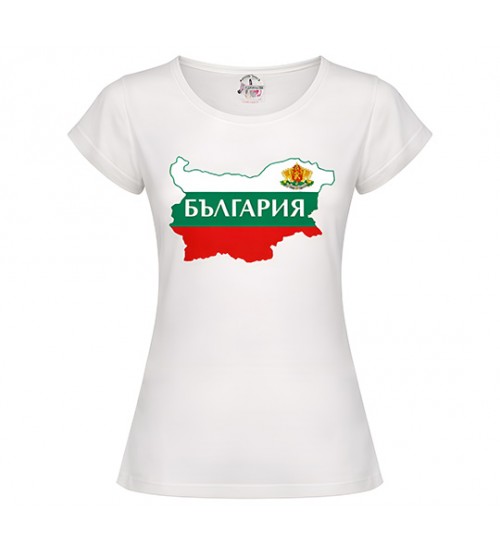 Стилна и модерна дамска тениска България с патриотичен дизайн – карта на България в цветовете на националния флаг и герб. Перфектен избор за 3 март, празници, подарък или ежедневно носене.