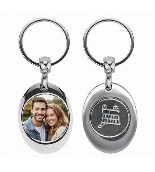 Практичен и стилен метален ключодържател със снимка, който включва и монета за количка в супермаркета. Така винаги ще имате под ръка монета, когато пазарувате.
