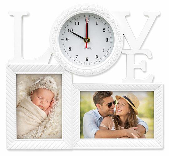 Декоративен стенен часовник LOVE с 2 рамки за снимки е стилен и практичен фото подарък, който съчетава стенен часовник и рамки за снимки в едно. Изработен в елегантен бял цвят, този модел е чудесно допълнение към интерио...