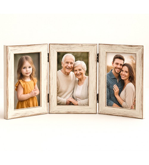 Рамката е изработена от висококачествен MDF материал с реалистична дървесна текстура, която съчетава модерното бяло с ретро винтидж излъчване. Трите секции са свързани с стабилни метални панти, позволяващи лесно поставяне върху бюро, етажерка или декоративна повърхност.